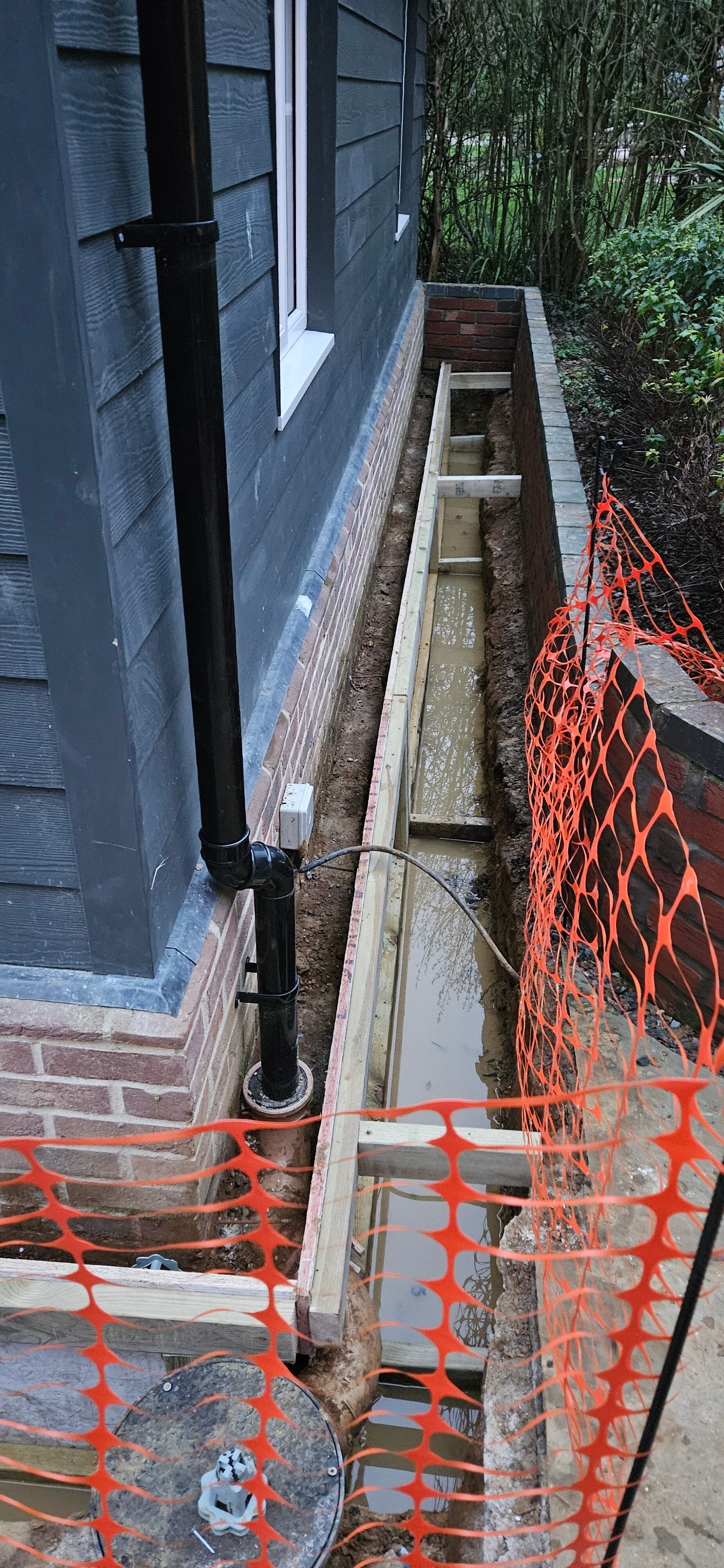Land drain installed around this garage which was suffering from severe damp problems internally. Concrete barrier was poured against the brickwork to stop water sitting directly on the brickwork, bitumen paint was then applied to the concrete to prevent moisture soaking into the concrete. A land perforated pipe was then installed around the garage to collect water, a connection was made into the existing storm drain to take the water away.