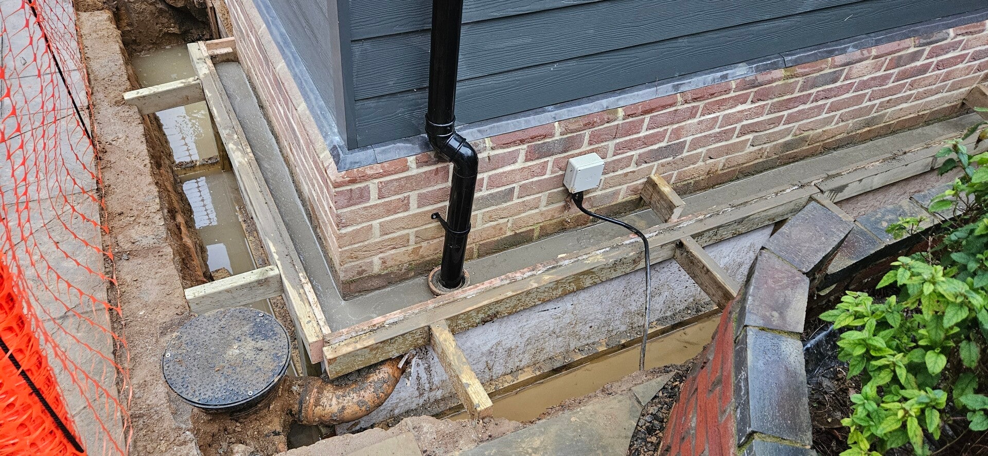 This property had a collapsed foul run under the house, a previous contractor had ran the sink waste into the rainwater gully outside. We had to make a connection into the existing foul run at the front of the property and install a new drain run through the living room and kitchen. This was a more difficult project as the site was still occupied and needed to be made safe and liveable by the end of each day.